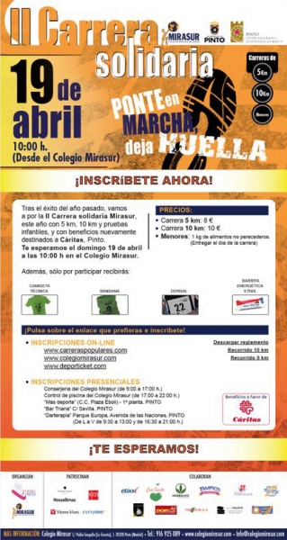 Tras el éxito del año pasado el colegio Mirasur ha organizado la II carrera solidaria ‘Ponte en marcha, deja huella’ que se celebrará a las 10.00 horas del 19 de abril con salida desde el propio centro. En esta ocasión habrá un recorrido de 5 km y otro de 10 km con un precio de inscripción de 8 € para los primeros y de 10 € para los segundos, y en el caso de los menores será de 1 kg de alimentos no perecederos que se entregarán el día de la prueba.