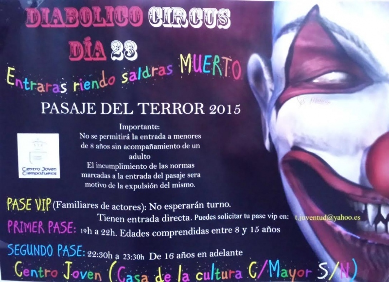 Bajo el título de ‘Diabólico Circus. Entrarás riendo saldrás muerto’, el Centro Joven de Ciempozuelos organiza el viernes 23 la fiesta de Halloween en la Casa de la Cultura.