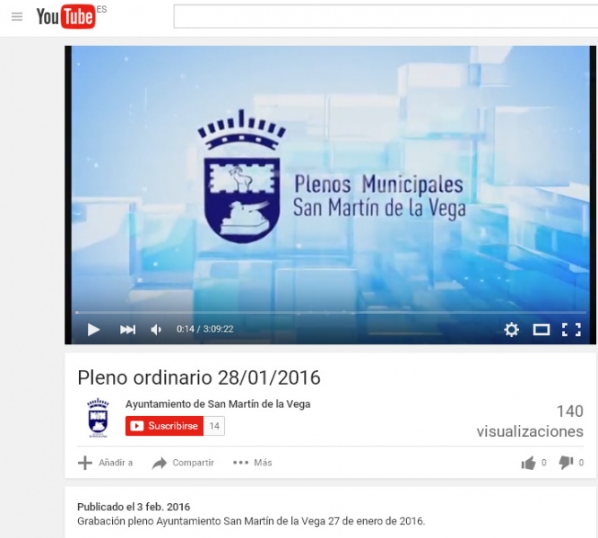 El Ayuntamiento de San Martín de la Vega ya ha colgado en su canal de Youtube el Pleno Municipal del pasado mes de enero. Así ocurrirá con los que se celebren a partir de ahora con el objetivo de facilitar a los vecinos la posibilidad de visualizarlos y “acceder a la máxima información posible”.