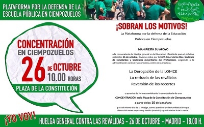 La Plataforma por la defensa de la Educación Pública en Ciempozuelos convoca una manifestación en la Plaza de la Constitución del municipio. Tendrá lugar el miércoles 26 de octubre con motivo de la huelga general convocada para ese día y la concentración que comenzará a las 18.00 horas en Neptuno y finalizará en Sevilla (Madrid).