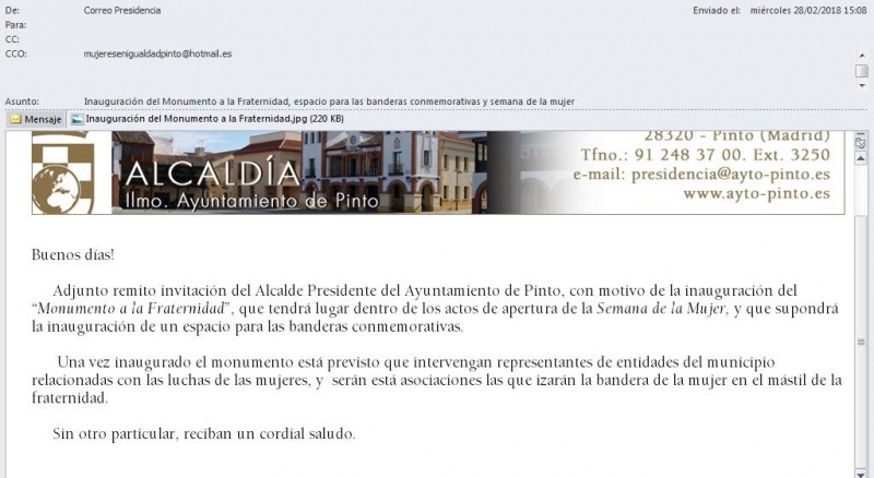La concejala de Igualdad, Tania Espada, ha negado las acusaciones: “A esta asociación se le invita a todo […] aunque nunca suelen acudir”. La edil ha querido desmentir las declaraciones de Mujeres en igualdad facilitado un pantallazo de la invitación que les hizo llegar el 28 de febrero, pero que fue enviada a un correo electrónico equivocado -su dirección correcta es mujeresenigualdadpinto@hotmail.com. La entidad pinteña dice no entender este error cuando, hasta la entrada de Ganemos Pinto, la relación con el Ayuntamiento era fluida y otras asociaciones y el resto de grupos políticos han contactado recientemente con ellas a través de ese email. "Cuando envías un email a un correo que no existe recibes otro mensaje diciéndote que no se ha encontrado esa dirección, la concejala también podría enseñar ese pantallazo", responden.