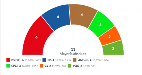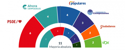 23.27: Con el 44,79% escrutado, estos serían los resultados: PSOE 6, PP 4, CPCI 4, Ahora Ciempozuelos 3, Ciudadanos 2, Vox 2.