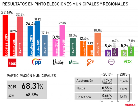 El PSOE volverá a gobernar en Pinto. Las elecciones locales del 26-M han otorgado nueve concejales a los socialistas en la nueva corporación, que estará formada por 25 concejales por lo que ha acabado a cuatro de la mayoría absoluta. Son precisamente los que ha obtenido Unidas Pinto, la confluencia que ha gobernado en el municipio estos cuatro años y que ha caído algo más que los 10 puntos que ha subido el PSOE.