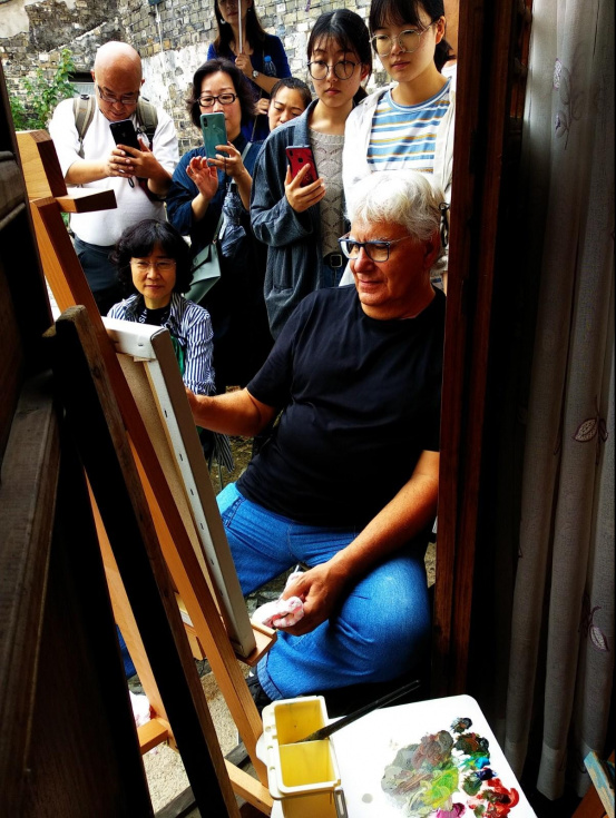 El escenario a retratar por los alumnos no ha sido otro que la ciudad de Luzhi, una ciudad llena de canales, conocida como la Venecia china, y en la que han podido trabajar especialmente la luz. Córdoba explica que enseñaba a los asistentes al curso a mantener la luz de la mañana a lo largo de todo proceso de creación del cuadro.