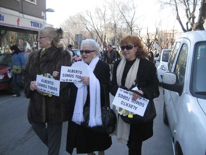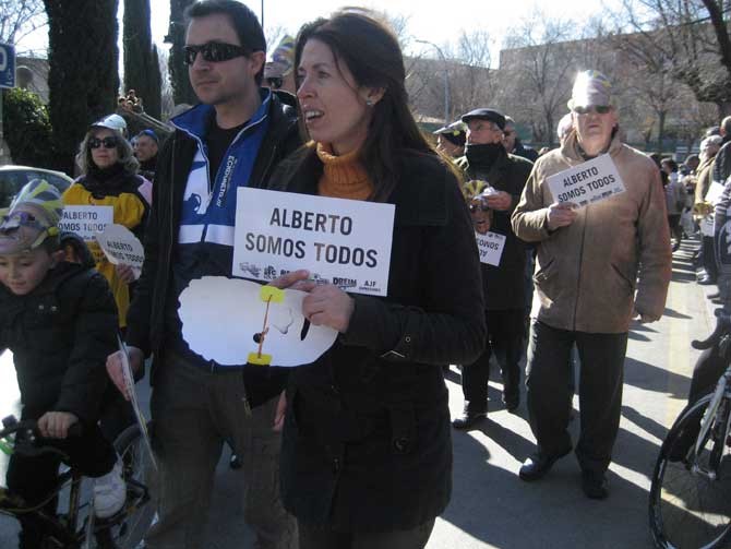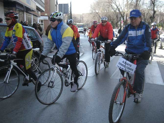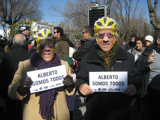 Muchos participantes llevan puesta una careta con la imagen del ciclista pinteño, identificándose con él, tal como reza el lema de la marcha: “Alberto Somos Todos”.