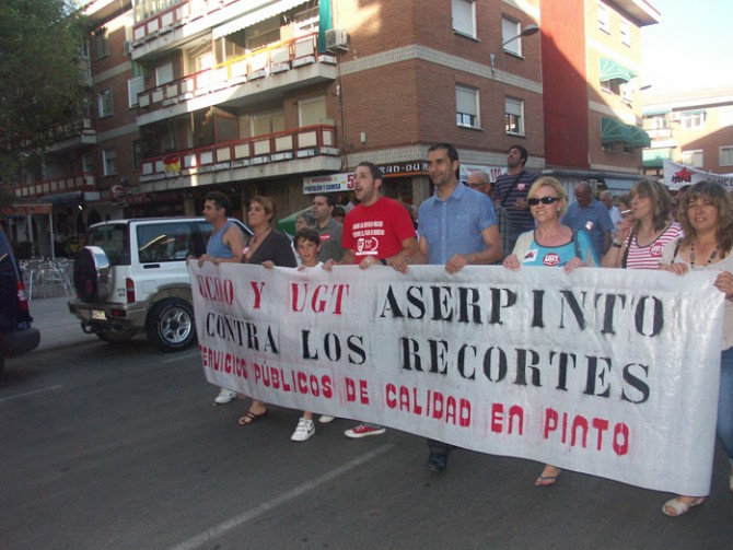 Fuerzas sociales y asociativas como UGT Aserpinto o el 15-M condujeron la manifestación por las calles de Pinto, acompañados de los partidos MIA –que ya declaró su apoyo a la movilización y su rechazo a las políticas que se están acatando tanto a nivel nacional como autonómico y local- y PSOE.