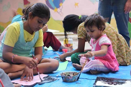 Puja es una interna de Matruchhaya de 13 años de edad, muy inteligente, que siempre ha destacado por su talento para el dibujo, de hecho procuramos apartarla un poco del resto durante esas sesiones creativas, porque los demás tienden a copiar lo que ella hace. Cuando el pasado lunes, el día siguiente a nuestro regreso a Nadiad desde Goa, les pedimos que crearan alguna imagen que su mente conservara de esa vivencia reciente, Puja me sorprendió con una acuarela realizada enteramente con sus dedos, sin utilizar pinceles, en la que me representaba a mí mismo sentado en una aparatosa silla de ruedas que empujaba Jodish.