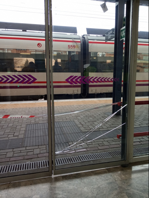 Las puertas de cristal de la estación de Cercanías de Pinto llevan más de un mes rotas. A finales de noviembre se produjeron una serie de actos vandálicos que acabaron con ambas puertas de salida a los andenes resquebrajada por varias zonas. "Fueron causados a patada limpia", informan el personal de la propia estación, que fue quien dio la alarma al día siguiente a Renfe para que enviasen al personal técnico a cambiarlas.