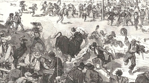 En esta imagen de los años 60 observamos la procesión de San Isidro justo antes de ascender por la vieja escalinata que da acceso a la iglesia parroquial de Santo Domingo de Silos.