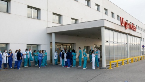 Profesionales del hospital de Valdemoro durante los aplausos a los sanitarios en el confinamiento.Desde el inicio de la pandemia han fallecido 14.896 personas en los hospitales madrileños.
