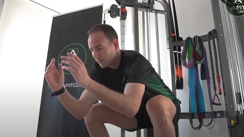 Ponerse de cuclillas sin levantar talones.