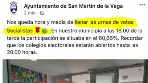 23.07 horas. El alcalde de San Martín de la Vega, el socialista Rafael Martínez, habla tras los resultados electorales: "Enhorabuena al Partido Popular de Madrid, claro vencedor de estas elecciones autonómicas. Como alcalde, tiendo la mano al nuevo Gobierno de la Comunidad de Madrid para trabajar por el bien de San Martín de la Vega y recuperar el tiempo perdido en estos dos últimos años. Tenemos mucho pendiente. Gracias a todos los afiliados y apoderados del PSOE por su trabajo y compromiso en esta campaña tan atípica. Como siempre, habéis dado ejemplo frente a las adversidades siendo los últimos en abandonar los colegios electorales".