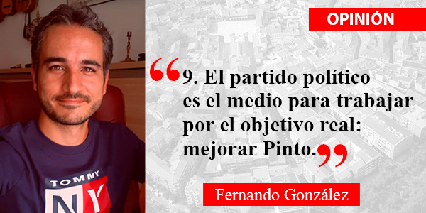 9. El partido político es el medio para trabajar por el objetivo real: mejorar Pinto. Cuando esta lógica se invierte, la ciudad se convierte en el medio y los intereses particulares o colectivos del partido son el fin real... Lo siento mucho, puede que no robes. Pero te has corrompido.
