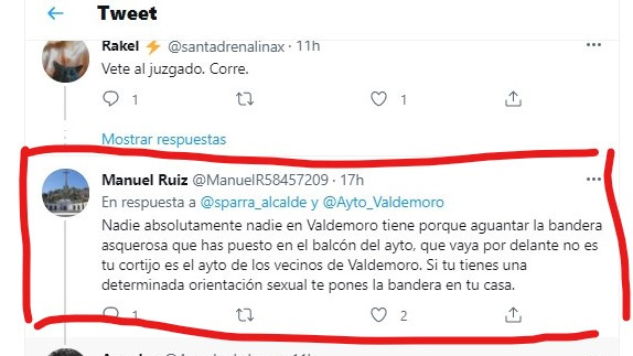 “Nadie absolutamente nadie en Valdemoro tiene por qué aguantar la bandera asquerosa que has puesto en el balcón del Ayuntamiento, […] no es tu cortijo. Si tú tienes una determinada orientación sexual te pones la bandera en tu casa”, escribió el usuario Manuel Ruiz en Twitter, que a raíz de la noticia publicada por ZIGZAG decidió borrar sus palabras. El regidor ha decidido ahora “dar un paso al frente” y denunciar todos los mensajes homófobos recibidos en las últimas horas: “Quien así se manifiesta está promoviendo un delito de odio contra la libertad de las personas y los derechos civiles. Ante comportamientos así hay que dar un paso al frente, por eso esta mañana lo he puesto en conocimiento de la autoridad judicial”.