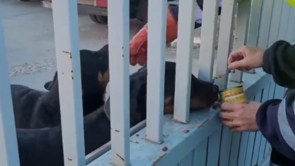 Aviso de 2 perros que se escapan de una nave e intimidan a los viandantes.