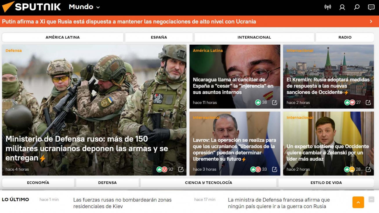 Hoy, la página web ofrece con todo lujo de detalles la última hora sobre la invasión a Ucrania por parte de Rusia o, como Sputnik denomina, “la operación especial de las Fuerzas Armadas de Rusia en las Repúblicas Populares de Donetsk y Lugansk”. Entre medias, pueden leerse noticias acerca de las consecuencias económicas que puede sufrir España si se sanciona al país ruso y otras que cuentan con llamativos titulares como ‘Rusia "invade", "ataca" y "lanza una ofensiva": las mentiras que nos vende Occidente’.