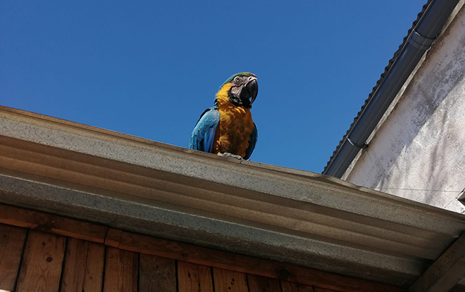 Coco es un pájaro feliz, con dueño y perfectamente cuidado. Vive libre y sin jaulas, junto a su familia, en una de las casas del barrio El Restón, pero de vez en cuando decide darse un paseo.