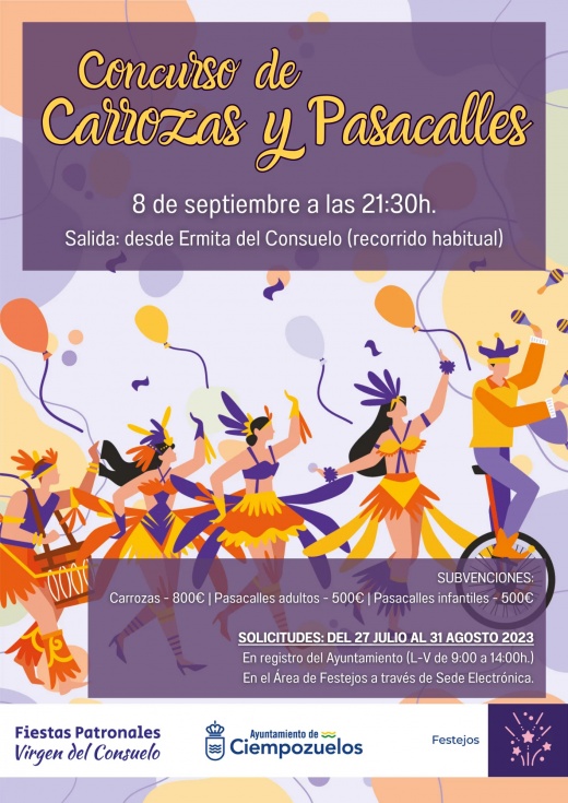 Las carrozas y pasacalles volverán a las calles de Ciempozuelos el viernes 8 de septiembre, a las 21.30 horas, con motivo de la celebración en la localidad de las fiestas patronales de Nuestra Señora del Consuelo. El Ayuntamiento publicó ayer las bases reguladoras y la convocatoria del concurso, al que destinará un importe total de 11.000 euros entre subvenciones (7.200 euros) y premios (2.600 euros), 3.000 euros menos que el año pasado.