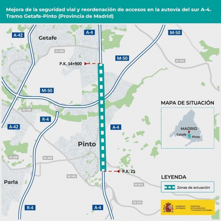 En total, invertirá 70 millones de euros en todas las obras previstas en la zona, que se ejecutarán, en concreto, en un tramo de 6,1 kilómetros ubicado entre el polígono industrial Los Molinos, de Getafe y el enlace con la M-841, dentro del término municipal pinteño.