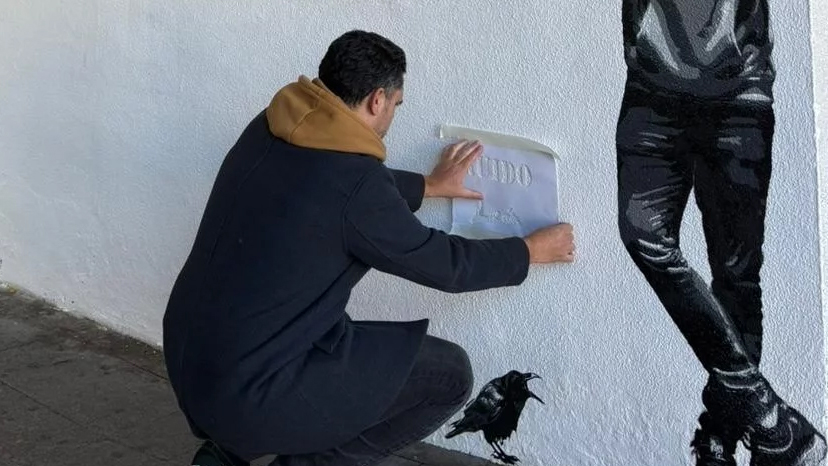 Alberto León es considerado uno de los artistas callejeros más importantes de nuestro país. Ha firmado obras exitosas como ‘El beso’ o ‘El penalti’ y ha expuesto en galerías como la Graffik Gallery de Londres o la Gallery 27 de Dubái. El artista tardó tres días en completar el mural, realizado con la técnica de aerosol y papel, una técnica en la que el artista completa el mural dándole forma con el papel para crear figuras y rellenar espacios de forma precisa.