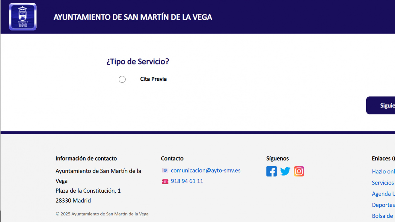 Para solicitar una cita previa tan sólo es necesario acceder a este enlace de la página web del Ayuntamiento de San Martín de la Vega. Fuentes municipales explican que se trata de una medida que “forma parte de un conjunto de iniciativas orientadas a la digitalización de los servicios públicos, con el objetivo de simplificar procedimientos y mejorar la calidad de la atención”.