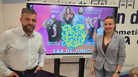 El alcalde, Rafael Martínez, y la concejala de Festejos, Vanesa Mena, durante la presentación de Vegafest.Se celebrará en junio en el campo de fútbol municipal.